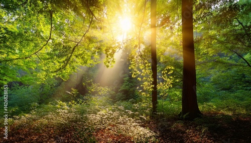 © Miller, Obraz premium magical sunlight through forest leaves with copy space