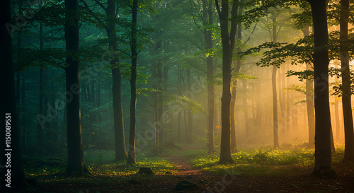 © ArRahman, Fototapeta premium Magical Sunrise Forest Path Misty Woods Trees Nature