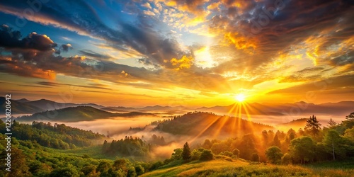 Obraz premium Magical Sunrise: Golden Hour Landscape Photography, Early Morning Sun Rays,...