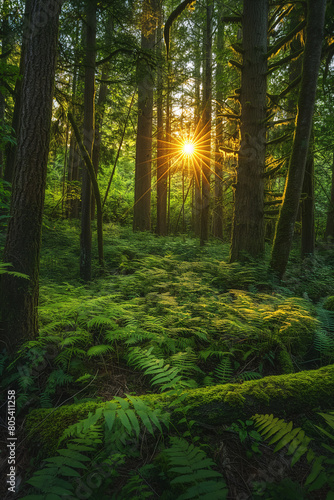 Fototapeta premium Magical sunrise peers through the dense forest, casting a warm glow over vibrant green ferns and ancient towering trees