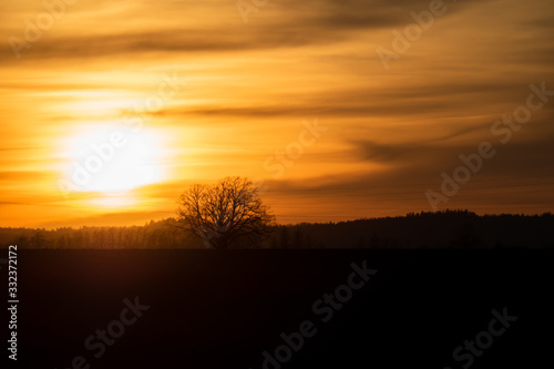 © Vojtch, Fototapeta premium Magical sunrise sun behind the tree. There is a golden sky in the background. Dark clouds in the sky