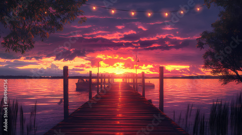 © Thiago, Fototapeta premium Magical sunset celebration on the lakeside dock. Twilighted. Illustration