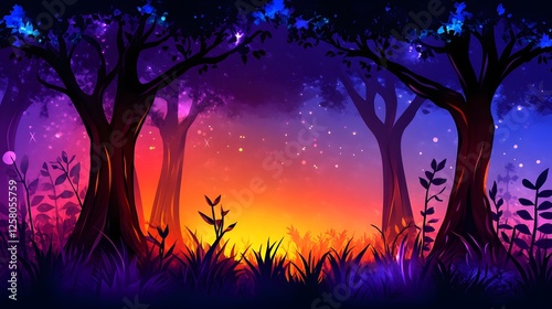 Obraz premium Magical Sunset Forest Landscape Painting, Vibrant Colors, Fantasy Art