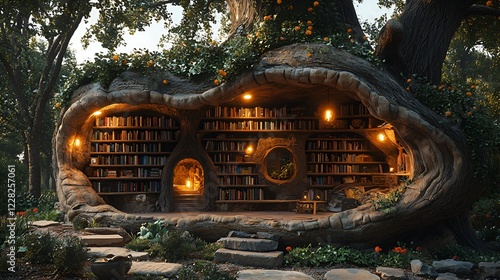 Obraz premium Magical tree library, forest setting, evening ambiance, reading nook