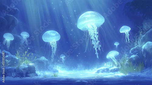 Fototapeta premium magical underwater scene with glowing jellyfish and serene ambiance