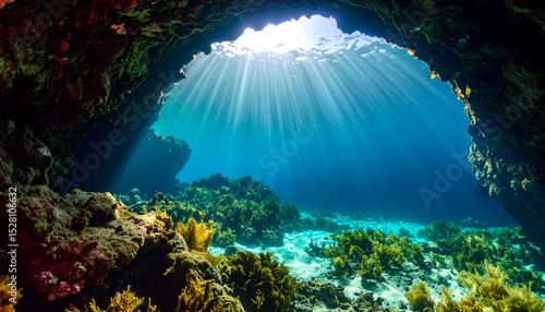 © Riski Digital Studio, Obraz premium Magical Underwater Sea Cave Sunbeams Illuminate Coral Reef