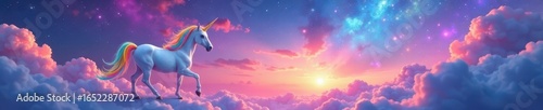 Fototapeta premium Magical unicorn, rainbow mane & tail, clouds, stars, vibrant sky, mystical,...