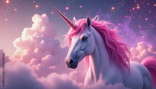 Fototapeta premium Magical unicorn with pink mane in dreamy cloud background