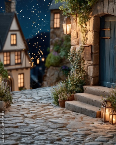 © Linda Kumakura, Naklejka premium Magical Village Architecture Charming Evening Village Scene with Cobbled Pathway and Warm Illuminations high quality design