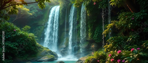 © Flop, Obraz premium Magical Waterfalls in Lush Green Landscape