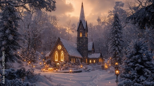 © Thanachart, Fototapeta premium Magical winter church at sunset, snow scene.