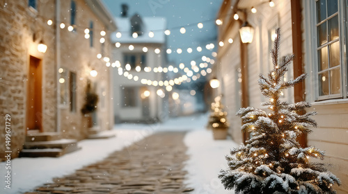 Fototapeta premium Magical winter evening with twinkling lights and decorated christmas tree in snowy alley