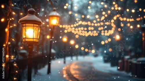 Naklejka premium Magical Winter Evening with Warm Lanterns and Twinkling Snowy Lights