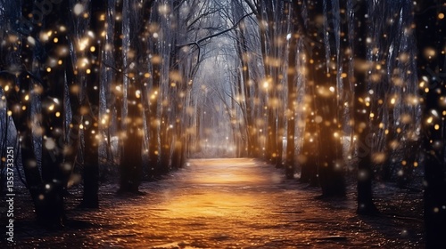 © Suci, Obraz premium Magical Winter Forest Path Glowing Lights Snow