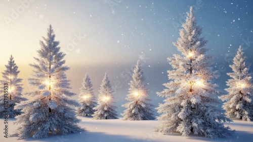 © sofikul, Fototapeta premium Magical winter forest scene with snow covered pine trees illuminated by soft warm lights and falling snowflakes