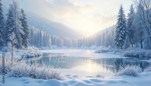 Fototapeta premium Magical winter landscape with a frozen lake and snow-covered trees under soft sunlight
