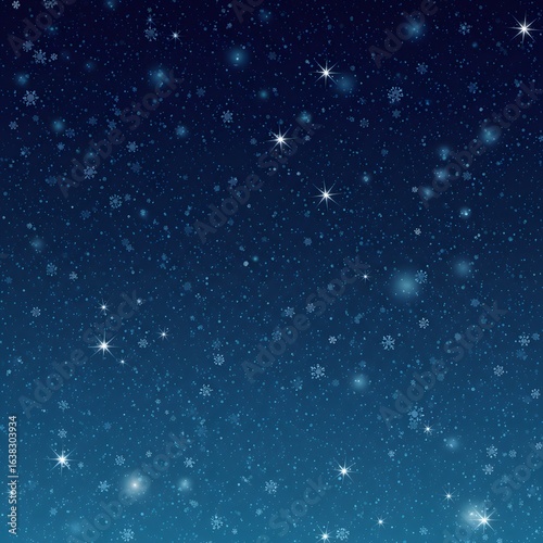 © Se, Obraz premium Magical winter night sky with sparkling stars and delicate falling snowflakes. Abstract celestial blue gradient background.