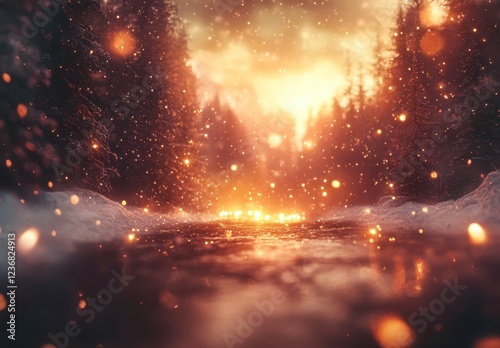 © A4719, Fototapeta premium Magical winter scene A snowy path winds through a dark forest, illuminated by warm, golden light. Sparkling particles float in the air, creating a