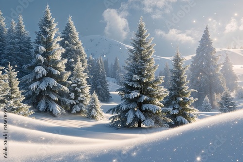 Naklejka premium Magical Winter Scene with Shimmering Evergreen Trees and Gentle Snowy Hills