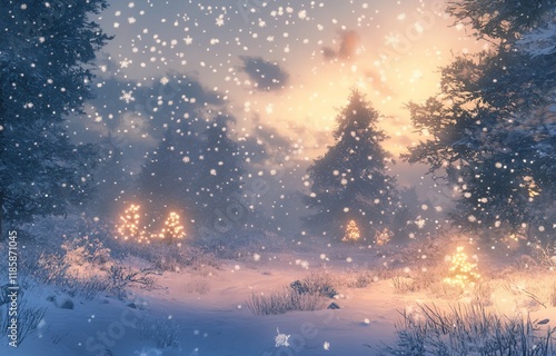© BerkahStock, Naklejka premium Magical winter sunset in snowy forest with glowing trees.