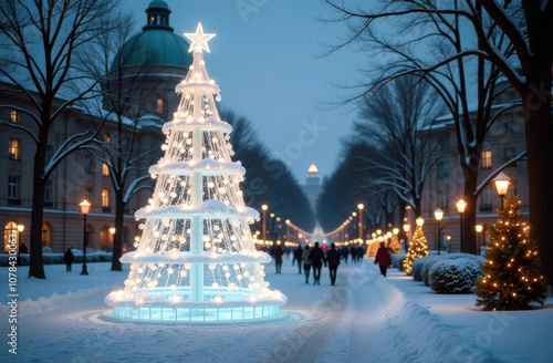 Obraz premium Magical winter wonderland: illuminated christmas tree on snowy evening