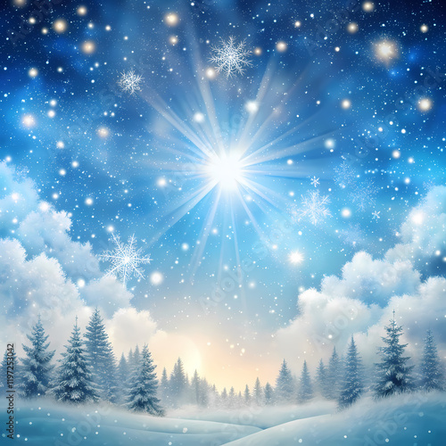 Naklejka premium Magical Winter Wonderland Snowy Forest Scene Bright Sun Rays blue cold calm...