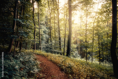 © ohenze, Fototapeta premium Magischer Waldweg mit warmer Sonne