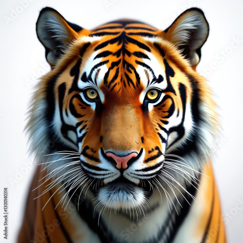 Naklejka premium Magnificent bengal tiger portrait. Striped fur, feline predator with orange, black stripes. Wild animal gazes with piercing yellow eyes. Jungle cat, isolated big mammal head on white background,