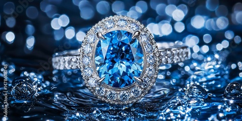 Obraz premium Magnificent blue gemstone ring surrounded by diamonds on a shimmering surface