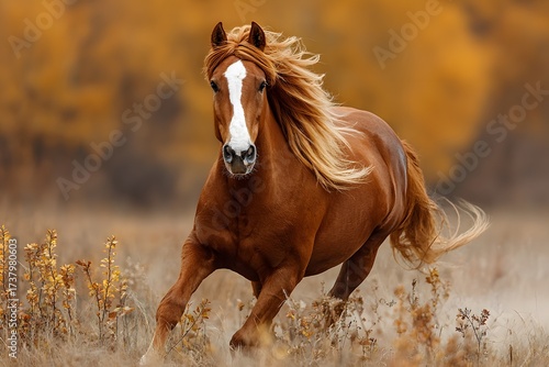 © horizon, Obraz premium Magnificent chestnut horse with a flowing blonde mane and tail is captured mid-gallop across a sunlit field, conveying a sense of freedom and energy.