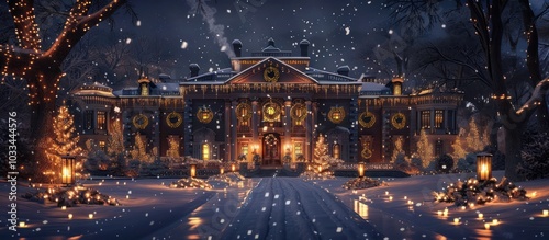 Naklejka premium Magnificent Christmas themed Historic House Covered in Sparkling Lights and Snow on a Serene Winter Night The stately and elegant home is beautifully decorated for the holiday season