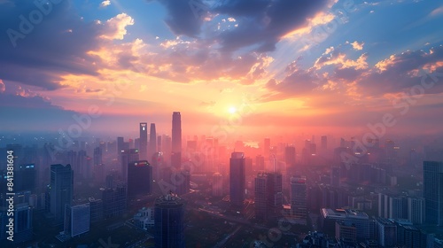 © Thares2020, Fototapeta premium Magnificent Cityscape at Sunset Soaring Skyscrapers Illuminated Against the Dramatic Sky