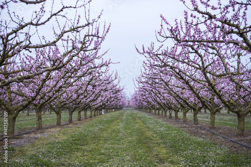 © marcomaccolini, Obraz premium Magnificent field of peach trees in bloom