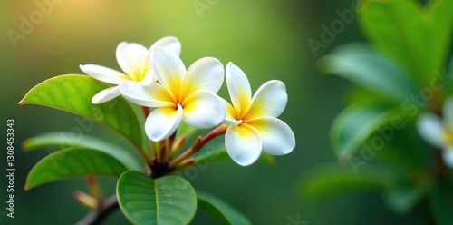 © Steve, Obraz premium Magnificent Frangipani tree, fragrant white flowers , garden, closeup