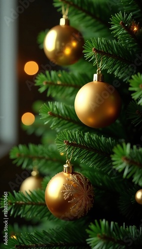 Fototapeta premium Magnificent golden baubles on a vibrant green Christmas tree , shine, holiday...