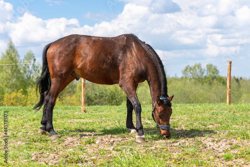 Obraz premium Magnificent graceful chestnut horse in meadow field.The horse eats the grass. Summer,spring sunny day.