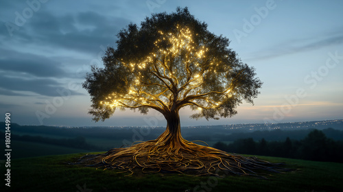 © Nick, Obraz premium Magnificent illuminated tree on a hilltop in a serene landscape with roots and branches glowing