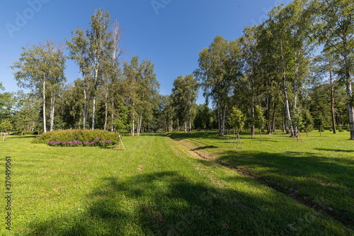 © Sergey Potapov, Naklejka premium Magnificent landscape of the Park with mown grass and deciduous trees on a beautiful Sunny day.