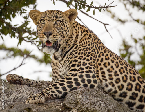 © dmussman, Fototapeta premium Magnificent leopard in tree panting and looking off in distance