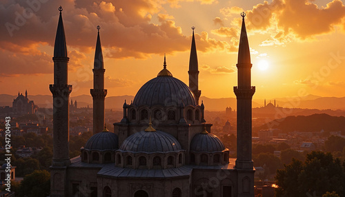 Fototapeta premium Magnificent mosque dome reflecting sunset, serene architecture