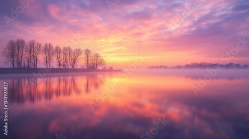 © Bayu, Fototapeta premium Magnificent pastel dawn reflecting on the still lake surface landscape