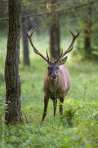 © WildMedia, Naklejka premium Magnificent red deer, cervus elaphus, chewing in forest and standing by a tree. Vertical composition of wild herbivore with antlers looking from front view with copy space.