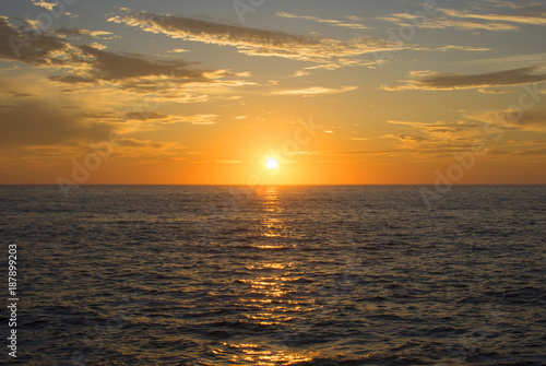 © Shakzu, Obraz premium Magnificent setting sun centered over ocean