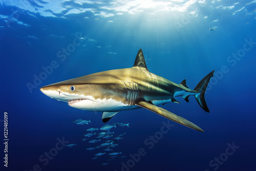 Fototapeta premium Magnificent shark gliding gracefully through the vibrant blue ocean alongside...