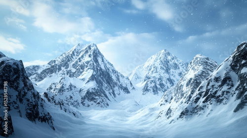 © Gun, Fototapeta premium Magnificent Snow-Covered Mountains Under Bright Sky with Clouds and Snowfall in Winter Landscape Setting Perfect for Nature and Travel Themes