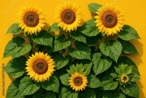 Fototapeta premium Magnificent sunflower field with golden blooms and verdant leaves against brilliant yellow sky backdrop