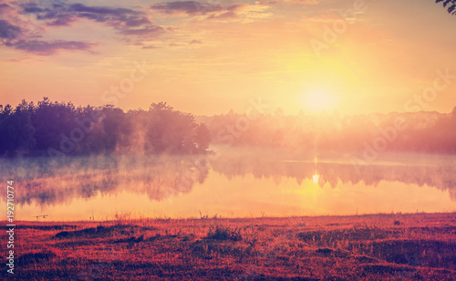 Fototapeta premium Magnificent sunny landscape. foggy lake with colorful sky, shining with...