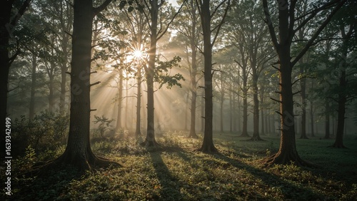 © Giovanni, Obraz premium Magnificent sunrise light filtering through forest foliage