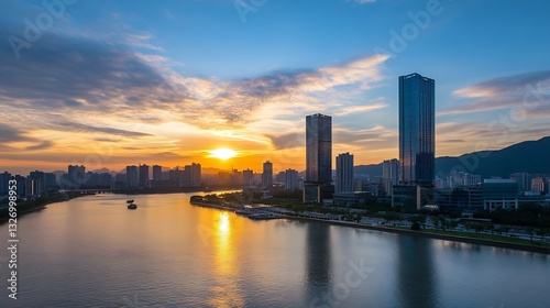 © Generative AI, Obraz premium Magnificent sunset skyline view over a modern city reflecting in the calm waters of a river at dusk : Generative AI
