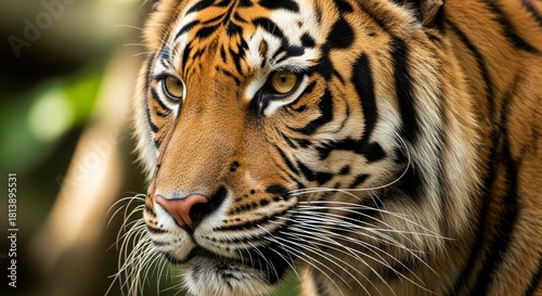 © Bounpaseuth, Fototapeta premium Magnificent Tiger Portrait: A close-up view of a regal tiger, its striking orange and black stripes and intense gaze evoke a sense of power and wilderness.